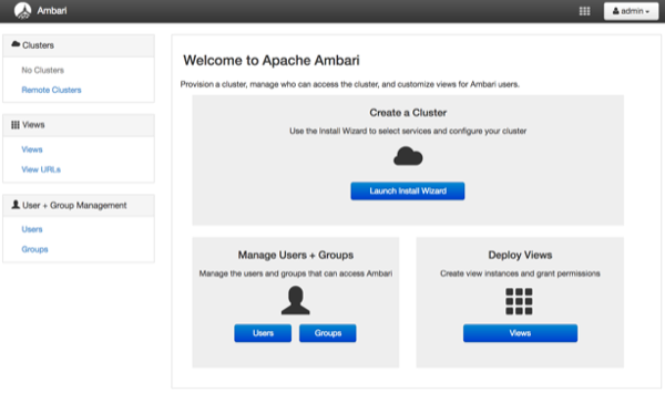 When you log in to Ambari, the Ambari Admin page displays links to the operations that you can perform. These operations are also available from the left navigation pane. If you have not created a cluster, you can launch the Apache Ambari Install Wizard to create one: