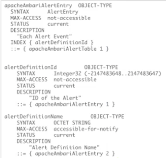 For SNMP notifications, Ambari uses a "MIB", a text file manifest of alert definitions, to transfer alert information from cluster operations to the alerting infrastructure. A MIB summarizes how object IDs map to objects or attributes.