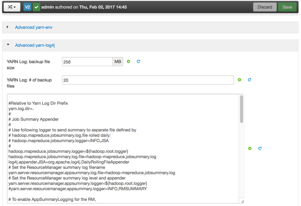 Ambari uses sets of properties called Log4j properties to control logging activities for each service running in your Hadoop cluster. Initial, default values for each property reside in a <service_name>-log4j template file. Log4j properties and values that limit the size and number of backup log files for each service appear above the log4j template file. To access the default Log4j settings for a service; in Ambari Web, browse to <Service_name> > Configs > Advanced <service_name>-log4j. For example, the Advanced yarn-log4j property group for the YARN service looks like: