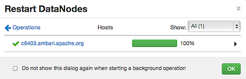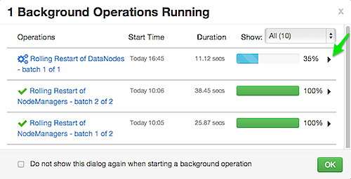 You can use the Background Operations window to monitor progress and completion of a task that comprises multiple operations, such as a rolling restart of components. The Background Operations window opens by default when you run such a task. For example, to monitor the progress of a rolling restart, click elements in the Background Operations window: