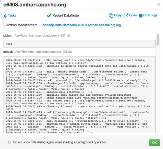 For example, choose Host Logs to view error and output logs information for host c6403.ambari.apache.org: