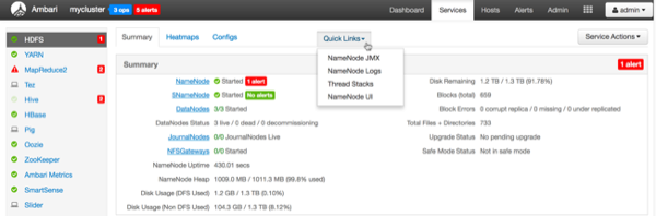 Select Quick Links options to access additional sources of information about a selected service. For example, HDFS Quick Links options include the following: