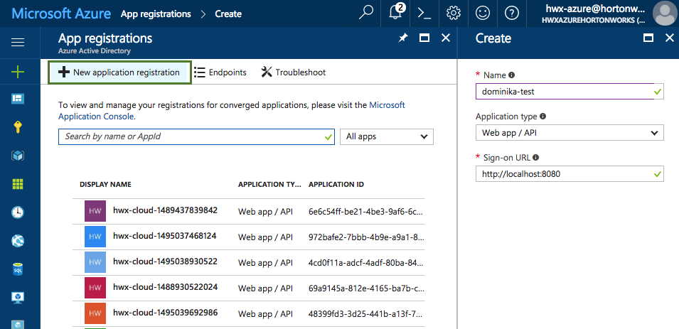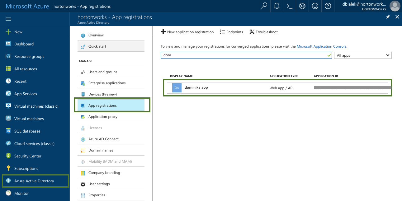 1. On Azure Portal, navigate to the Active Directory > App Registrations and register a new application. For more information, refer to Create an Azure AD Application.