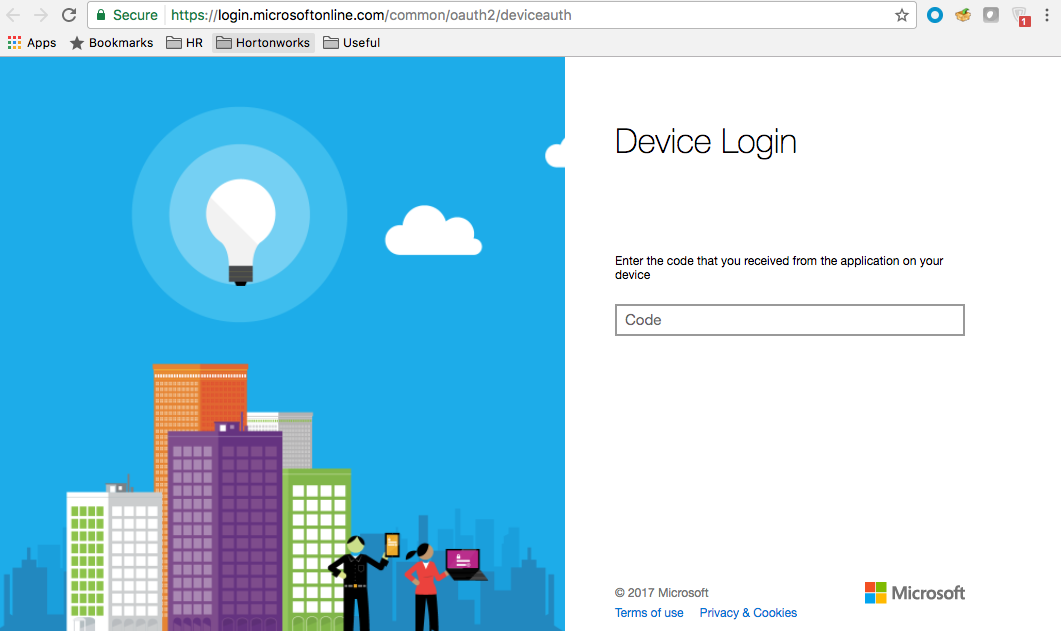 8. Click Azure login and a new Device login page will open in a new browser tab: