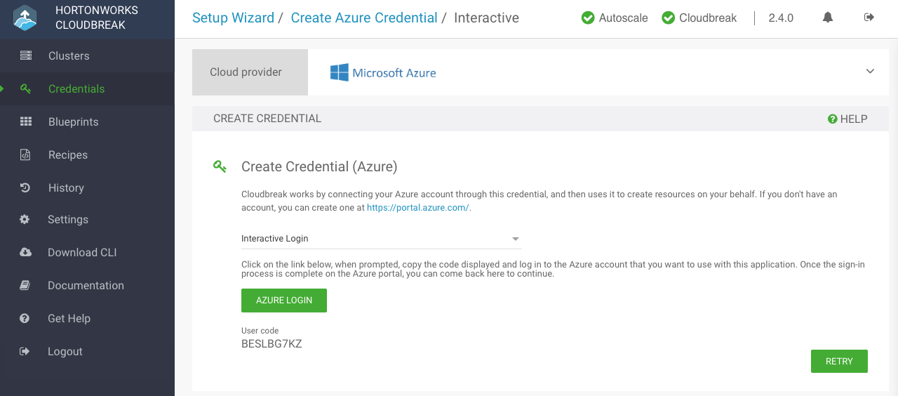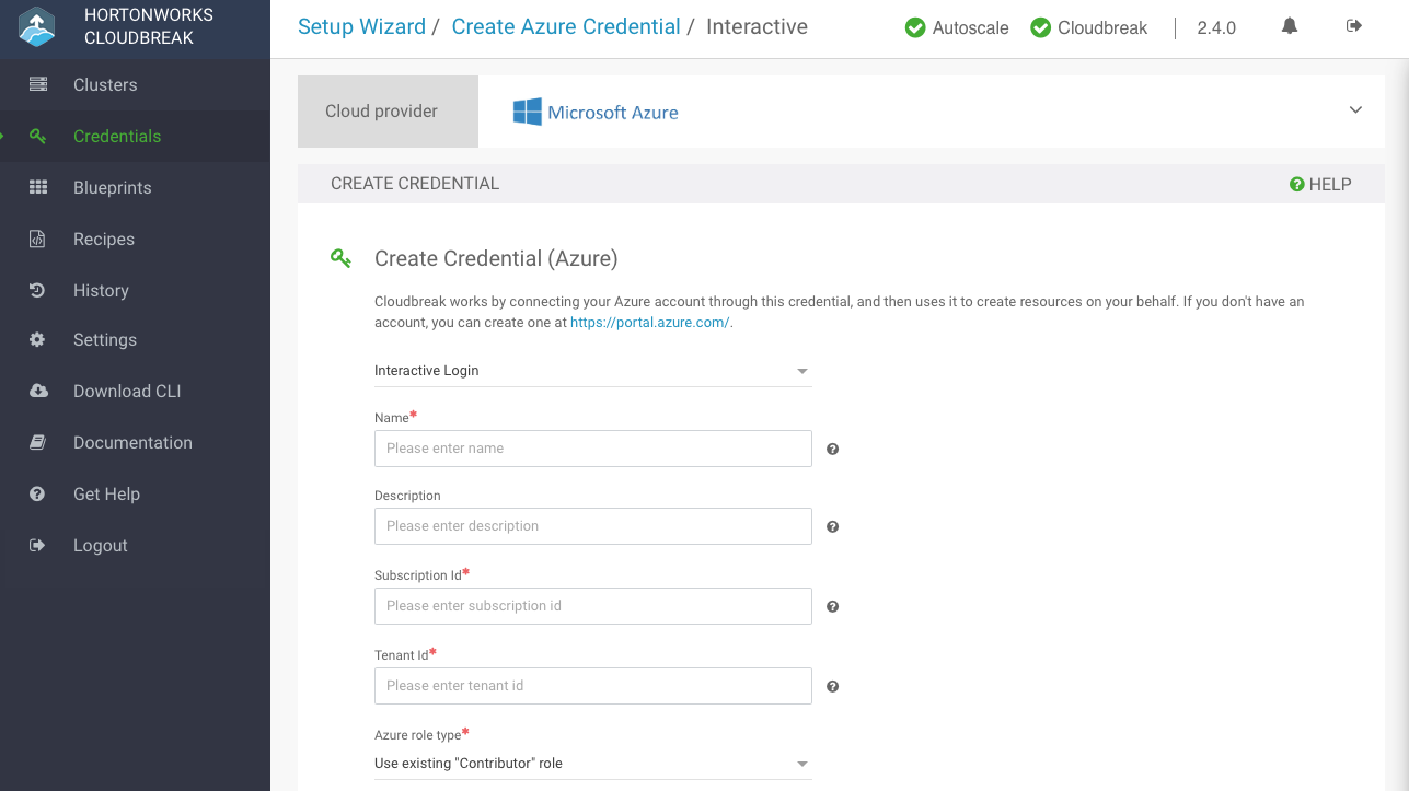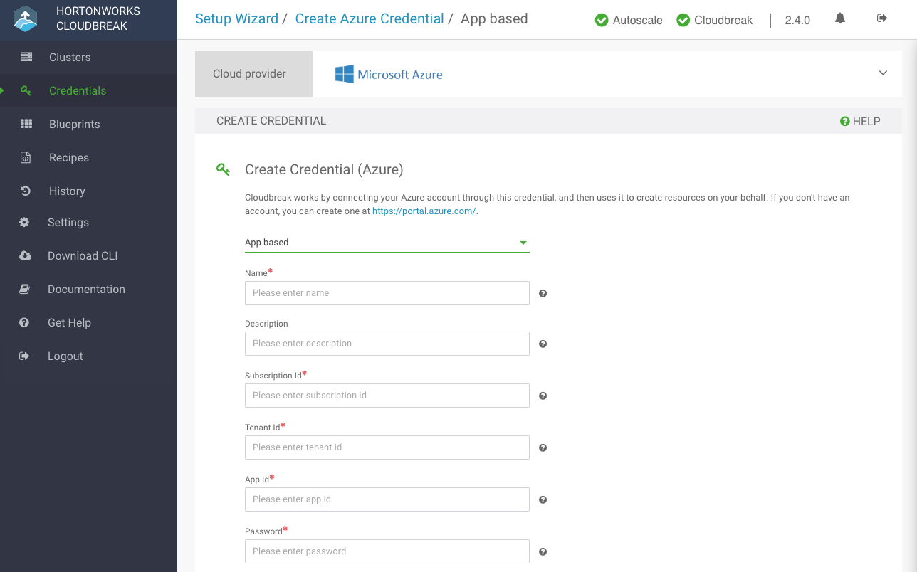 Before you can start creating clusters, you must first create a Cloudbreak credential. Without this credential, you will not be able to create clusters via Cloudbreak. Cloudbreak works by connecting your Azure account through this credential, and then uses it to create resources on your behalf.
