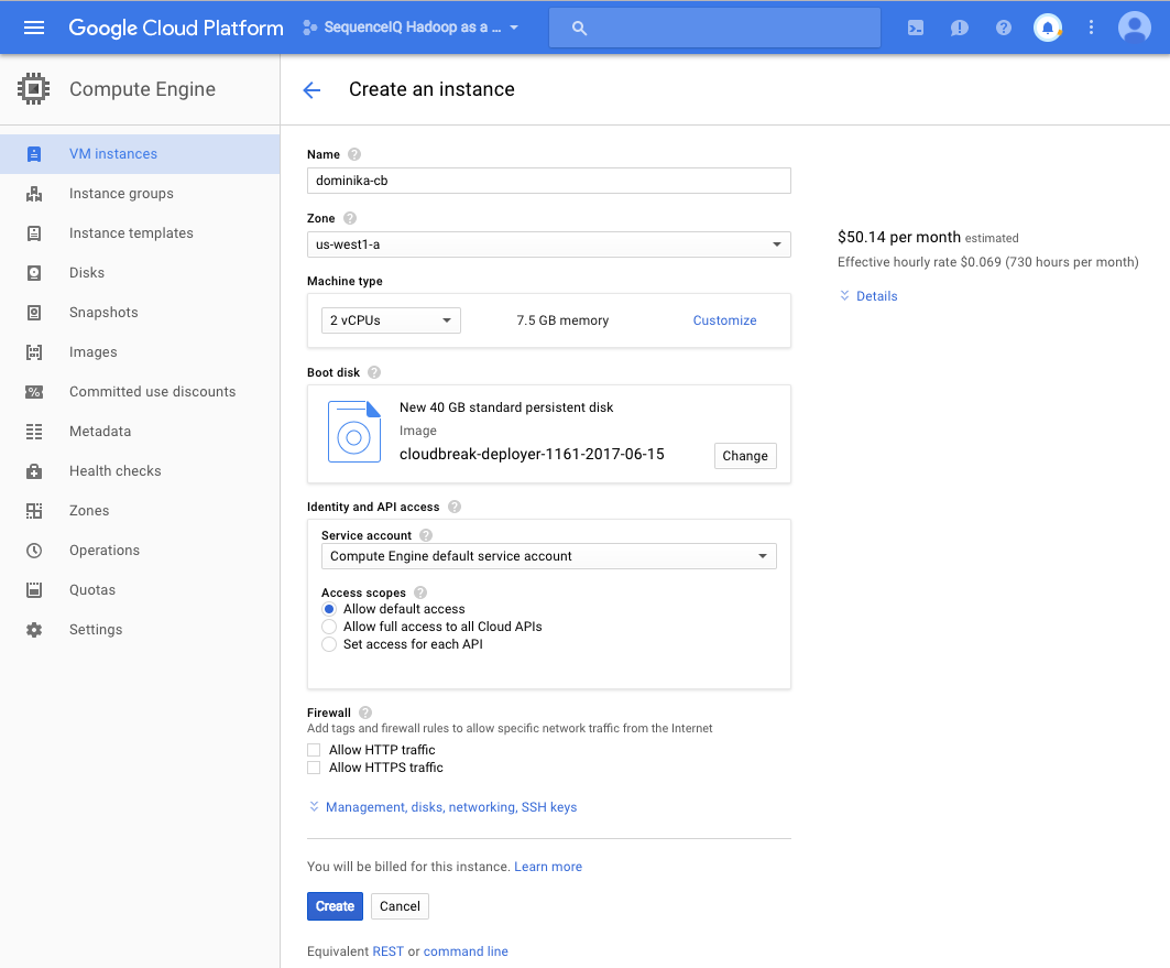 Parameter Description Name Enter a name for the VM. Zone Select the zone in which to launch the VM. Machine type The minimum instance type suitable for Cloudbreak is n1-standard-4. The minimum requirements are 16GB RAM, 40GB disk, 4 cores. Boot disk Verify that the Cloudbreak deployer disk which you imported earlier is pre-selected. -