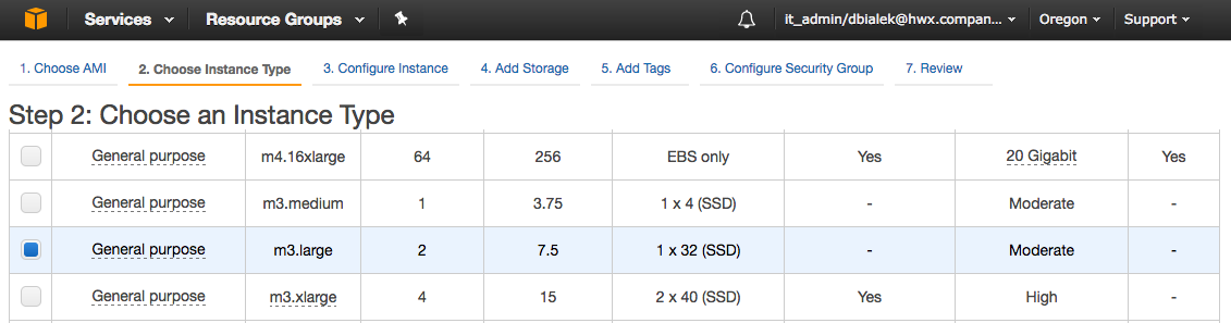 In Step2: Choose Instance Type, choose an instance type. The minimum instance type which is suitable for Cloudbreak is m4.xlarge. Minimum requirements are 16GB RAM, 40GB disk, 4 cores. When done, click Next.