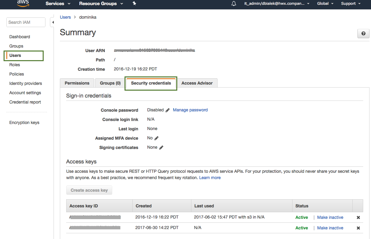 To perform these steps, you must know your access and secret key. If needed, you or your AWS administrator can generate new access and secret keys from the IAM Console > Users > select a user > Security credentials.