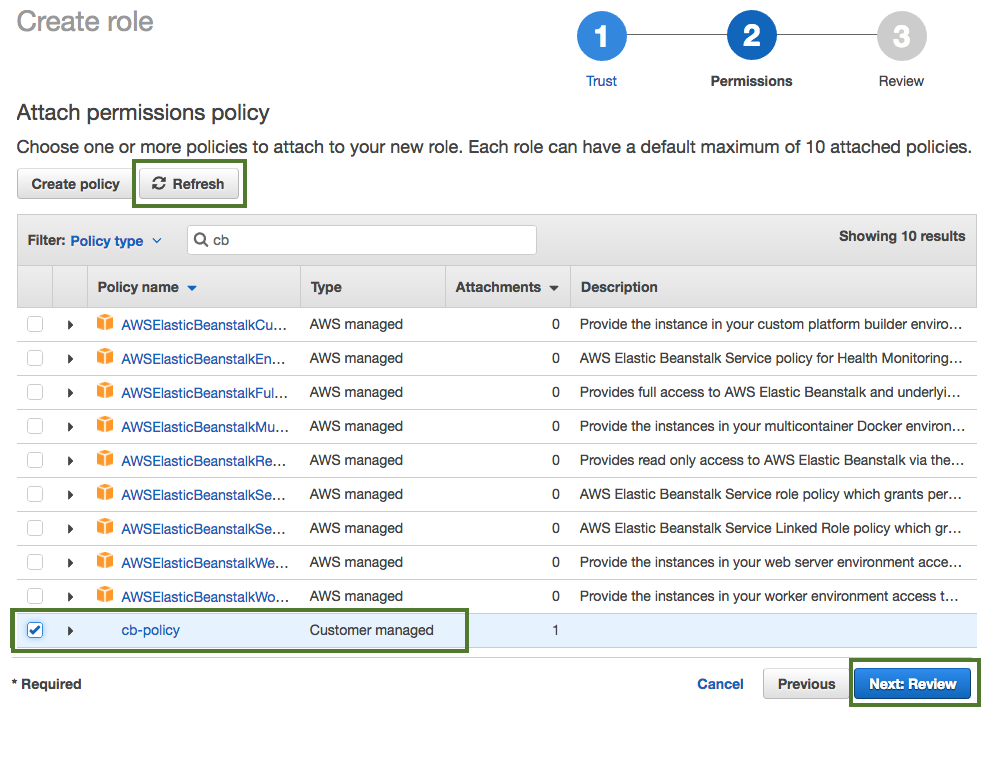 Click Refresh. Next, find the "cb-policy" that you just created and select it by checking the box.