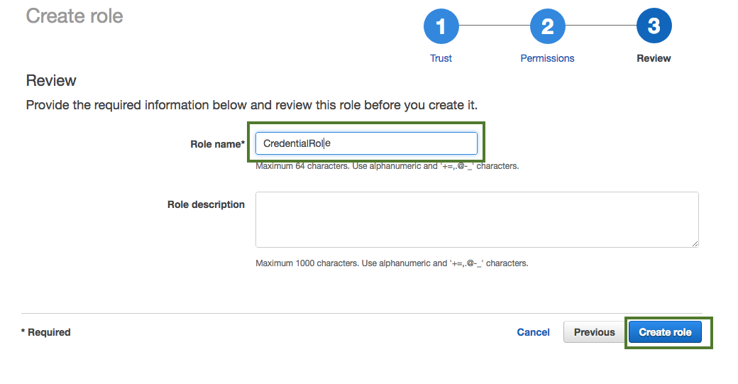To perform these steps, you must know the IAM Role ARN corresponding to the "CredentialRole" (configured as a prerequisite).