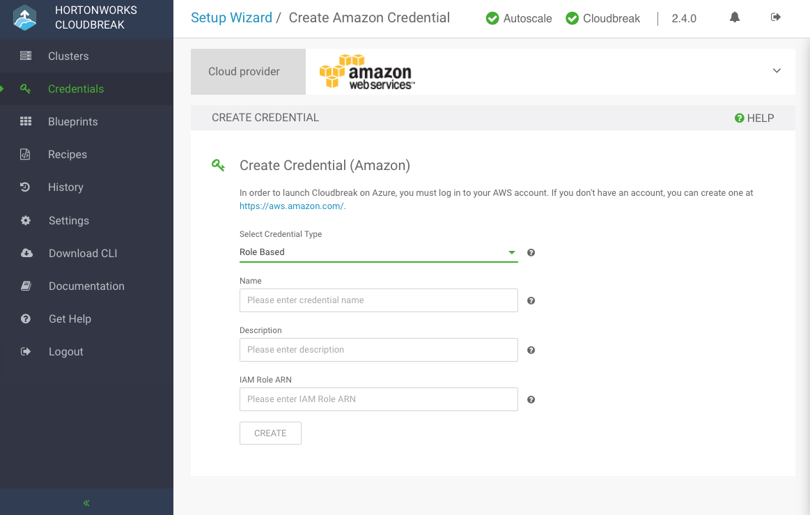 Before you can start creating clusters, you must first create a Cloudbreak credential. Without this credential, you will not be able to create clusters via Cloudbreak.