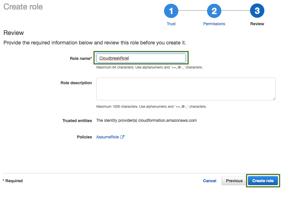 command. This command creates a role with the name "cbreak-deployer" (equivalent to the "CredentialRole"). To customize the name of the role, addexport AWS_ROLE_NAME=my-cloudbreak-role-name