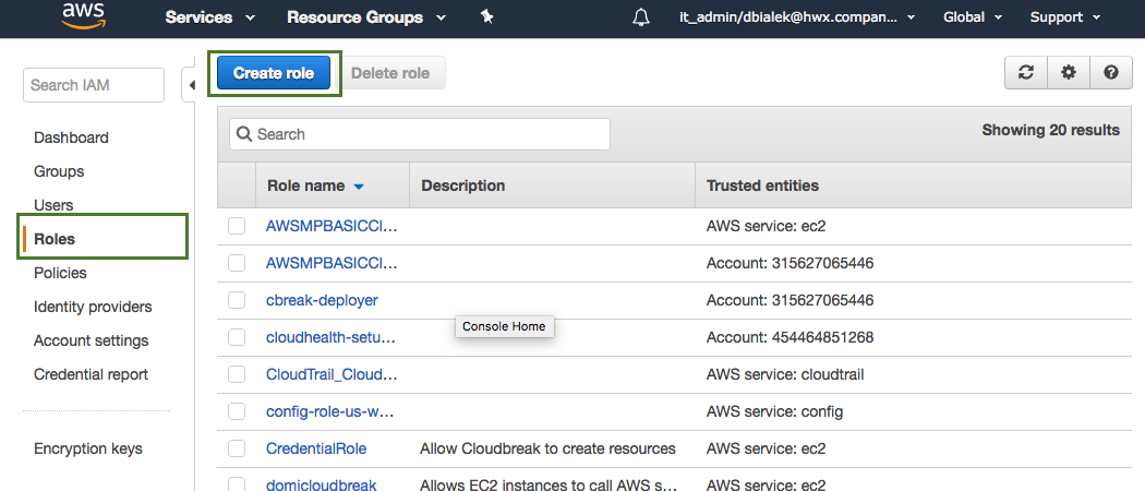 You can create these roles in the IAM console, on the Roles page via the Create Role option. Detailed steps are provided below.