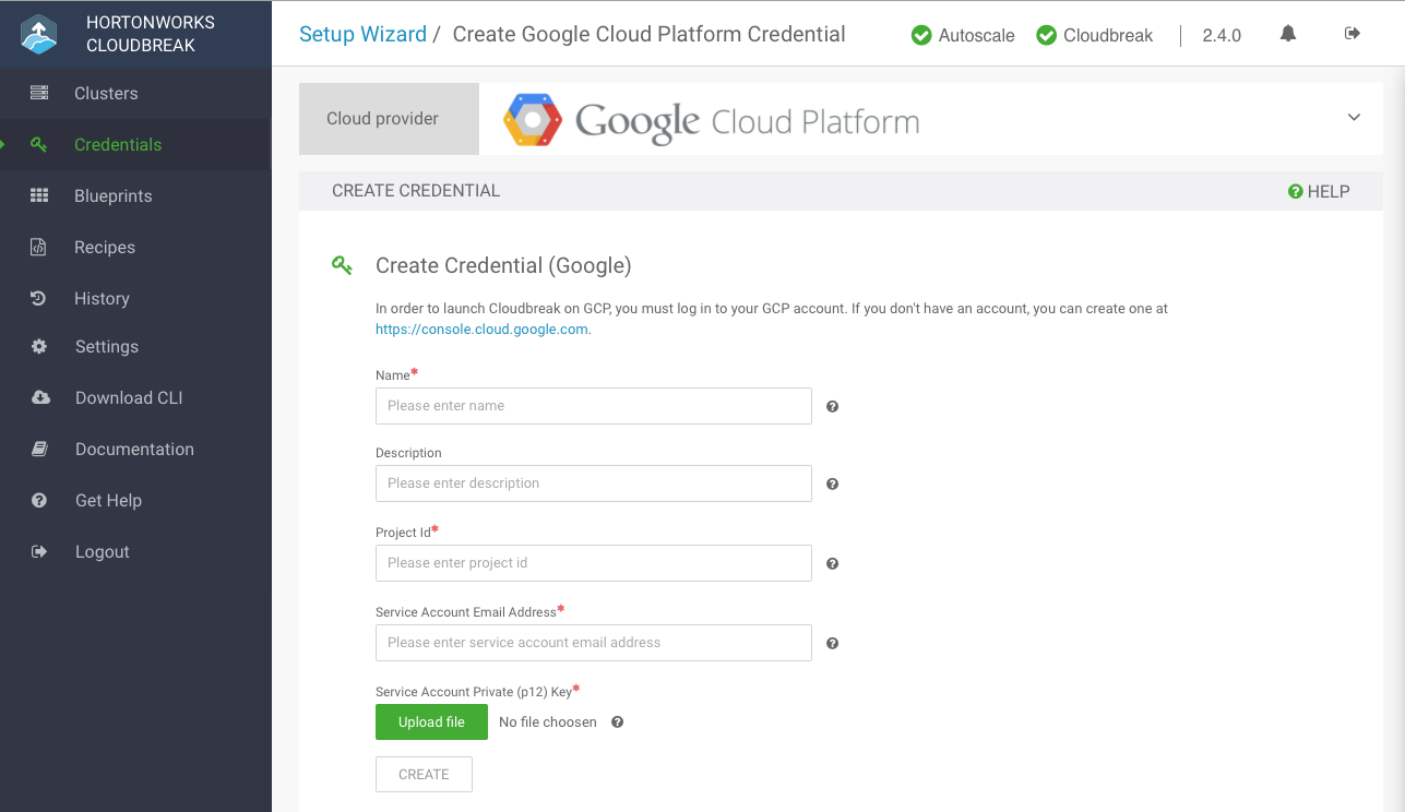 Cloudbreak works by connecting your GCP account through this credential, and then uses it to create resources on your behalf. Before you can start provisioning cluster using Cloudbreak, you must create a Cloudbreak credential.
