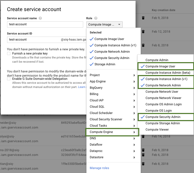In order to launch clusters on GCP via Cloudbreak, you must have a Service Account that Cloudbreak can use to create resources. In addition, you must also have a P12 key associated with the account. The service account must have the following roles are enabled: