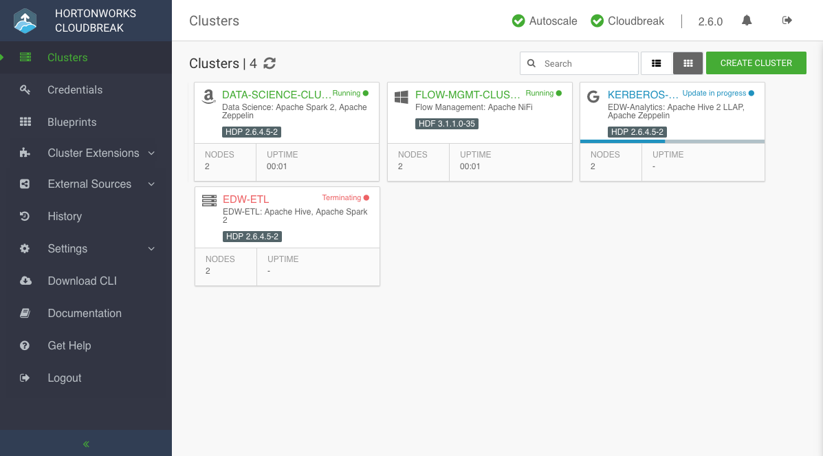 Cloudbreak allows you to create, manage, and monitor your HDP and HDF clusters on your chosen cloud platform:
