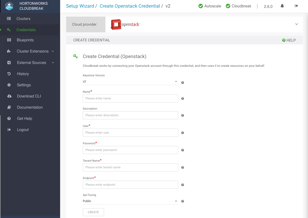 Cloudbreak works by connecting your OpenStack account through this credential, and then uses it to create resources on your behalf. Before you can start provisioning cluster using Cloudbreak, you must create a Cloudbreak credential.