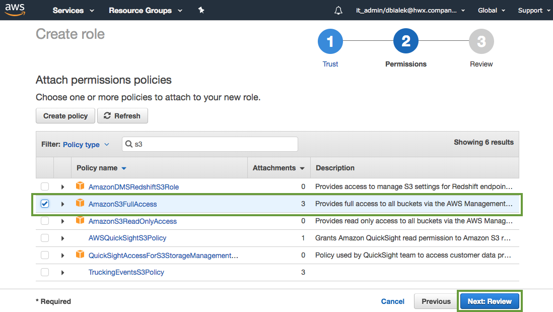 Select an existing S3 access policy or click Create policy to define a new policy. If you are just getting started, you can select a built-in policy called "AmazonS3FullAccess", which provides full access to S3 buckets that are part of your account: