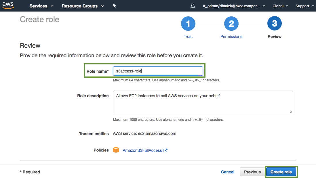 - You or your AWS admin must create an IAM role with an S3 access policy which can be used by cluster instances to access one or more S3 buckets. Refer to Creating an IAM role for S3 access.