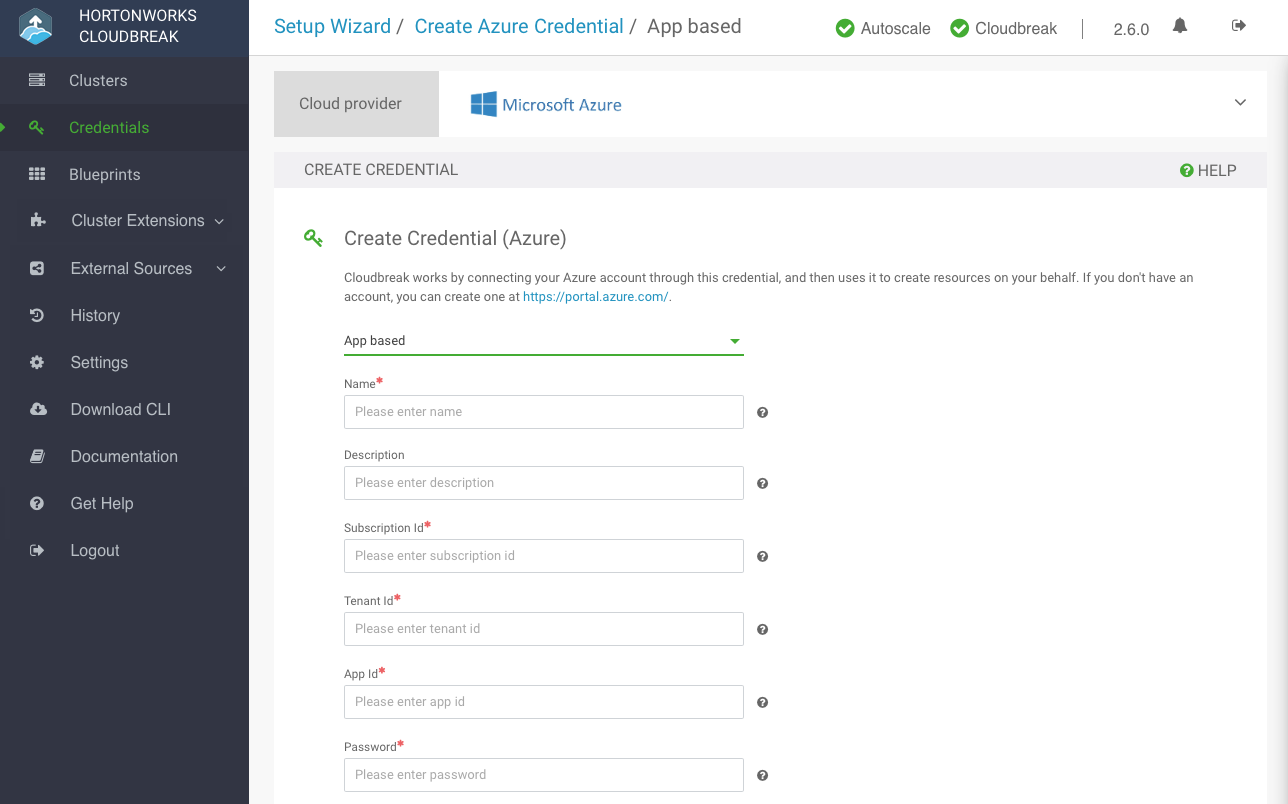 Before you can start creating clusters, you must first create a Cloudbreak credential. Without this credential, you will not be able to create clusters via Cloudbreak. Cloudbreak works by connecting your Azure account through this credential, and then uses it to create resources on your behalf.