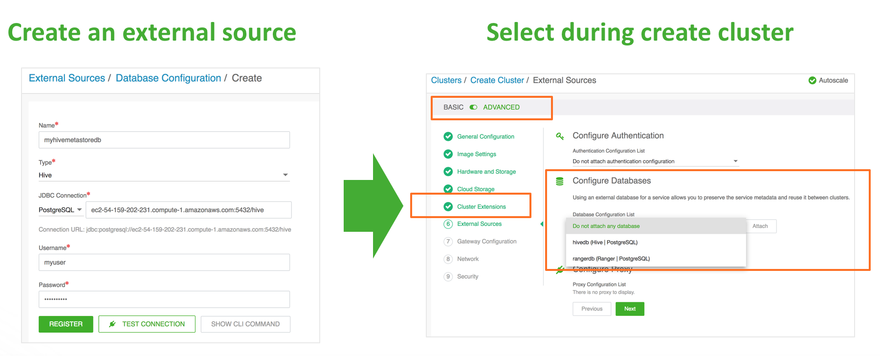 Cloudbreak allows you to define external sources that are created independently of a cluster -- and therefore their lifespan is not limited by the lifespan of any cluster -- and that can be reused with multiple clusters:
