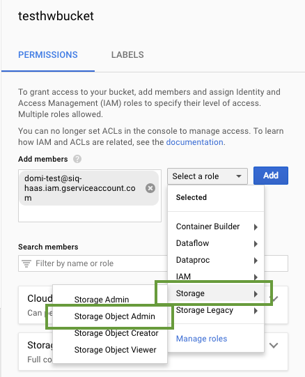 The service account must have the Storage Object Admin role for the bucket that you are planning to use. You can set this in the bucket's permissions settings: