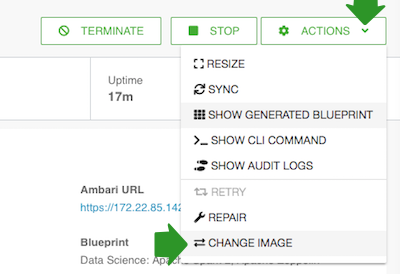 - Sync the cluster (Actions > Sync) to ensure that Cloudbreak has the latest image and package information.
