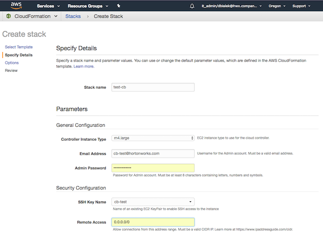 Parameter Description Specify Details section Stack name Enter name for your stack. It must be unique in your AWS environment. General Configuration section Controller Instance Type EC2 instance type to use for the cloud controller. Email Address Username for the Admin login. Must be a valid email address. Admin Password Password for Admin login. Must be at least 8 characters containing letters, numbers, and symbols. Security Configuration section SSH Key Name Name of an existing EC2 key pair to enable SSH to access the instances. Key pairs are region-specific, so only the key pairs that you created for a selected region will appear in the dropdown. Remote Access Allow connections to the cloud controller ports from this address range. Must be a valid CIDR IP. For example: - 192.168.27.0/24 will allow access from 192.168.27.0 through 192.168.27.255.