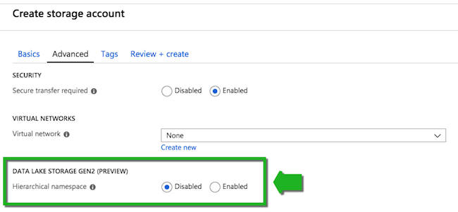 Optionally, you may enable the hierarchical namespace feature for the storage account: