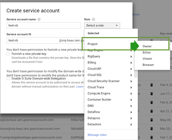 • The service account must have the project-wide Owner role: