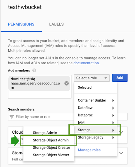 • The service account must have the Storage Object Admin role for the bucket that you are planning to use. You can set this in the bucket's permissions settings: