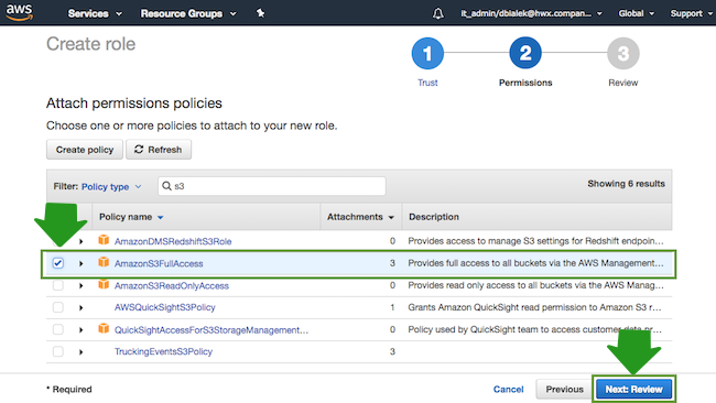 4. Select an existing S3 access policy or click Create policy to define a new policy. If you are just getting started, you can select a built-in policy called “AmazonS3FullAccess”, which provides full access to S3 buckets that are part of your account: