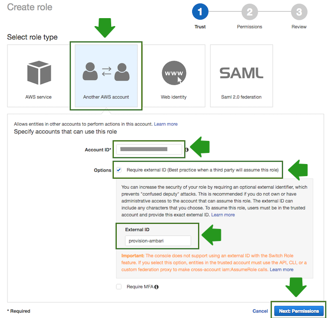 - In the “Create Role” wizard, select Another AWS account role type. Next, provide