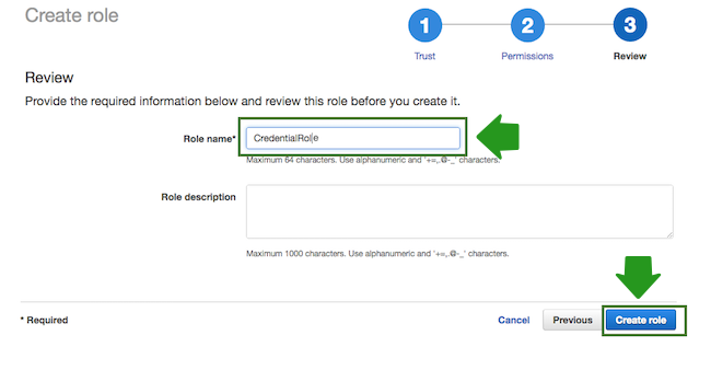 - In the Roles name field, enter role name, for example “CredentialRole”.