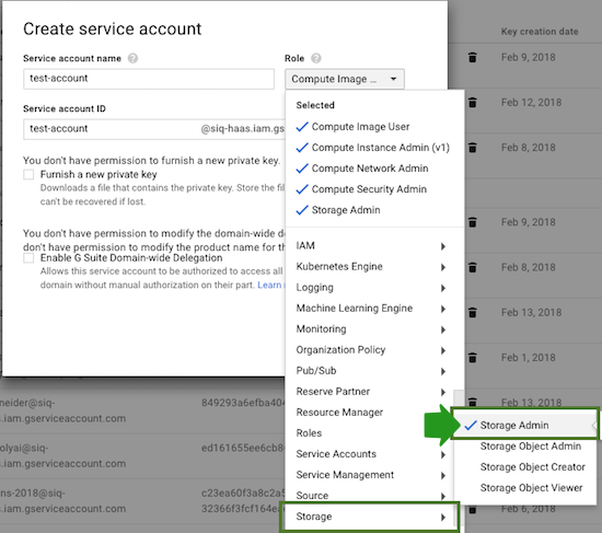 As a prerequisite for creating a credential, you must create a service account on GCP and generate a JSON key for that account. The service account must have the following roles are enabled: