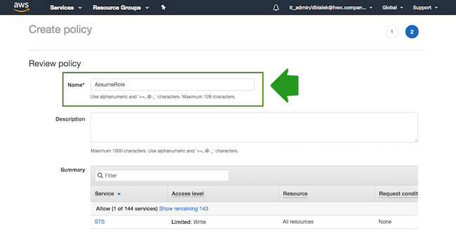 - On the Review policy page, in the Name field, enter a name for your