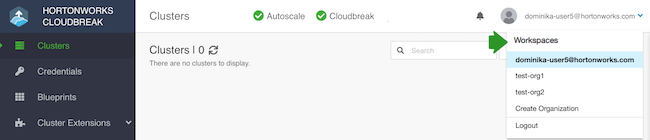 To manage workspaces, navigate to the Workspaces page accessible from the dropdown in the top-right corner in the Cloudbreak web UI: