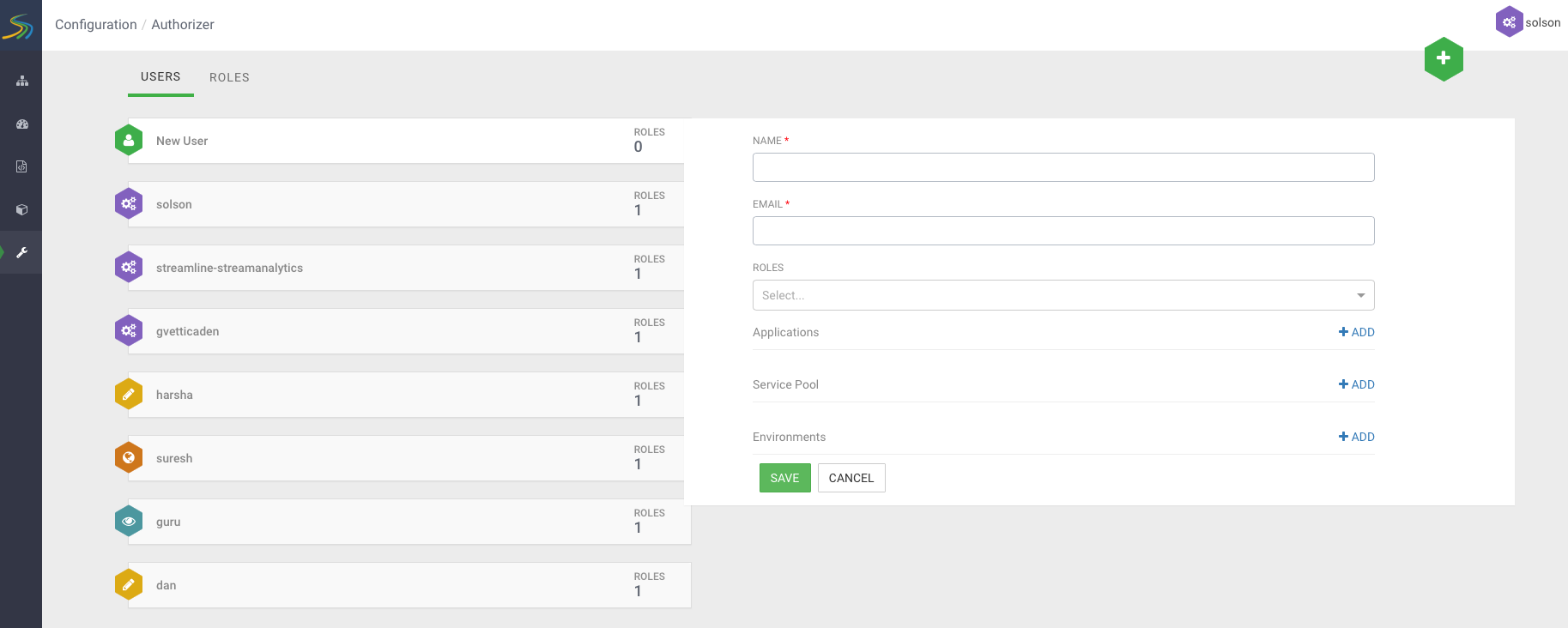 Using the streamline user to initially go into SAM, you can create other admin roles in the system that can administer user accounts for the rest of the organization. To create new admin account for user gvetticaden, perform the following steps: