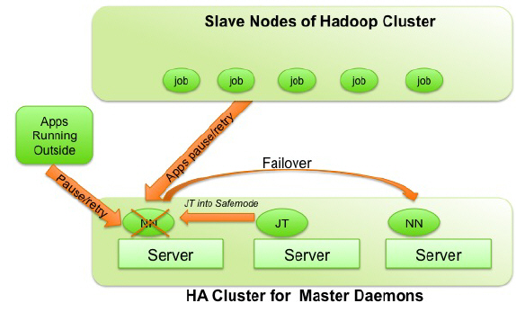 Applications running inside and outside the Hadoop cluster also automatically pause and retry their connection to the failed service.