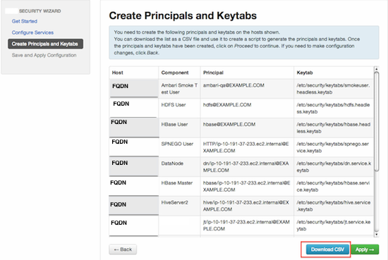 Note If you have a large cluster, you may want to go to the Create Principals and Keytabs step first. Step through the wizard accepting the defaults to get to the appropriage page. On the page, use the Download CSV button to get a list of all the necessary principals and keytabs in CSV form, which can be used to set up a script. The list includes hostname, principal description, principal name, keytab user, keytab group, keytab permissions, absolute keytab path, and keytab filename.