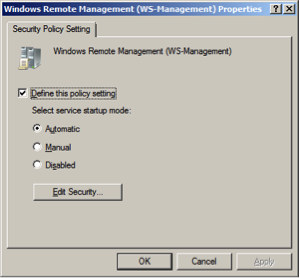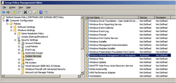 • Go to Computer Configuration -> Policies -> Windows Settings -> Security Settings -> System Services -> Windows Remote Management (WS-Management).