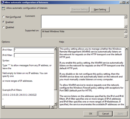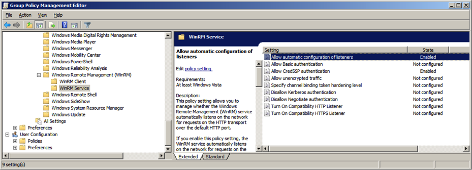 • Go to Computer Configuration -> Policies -> Administrative Templates -> Windows Components -> Windows Remote Management (WinRM) -> WinRM Service.
