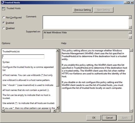 • Configure the trusted host list (the IP addresses of the computers that can initiate connections to the WinRM service). To do this, set TrustedHostsList to * (all addresses or specify range).