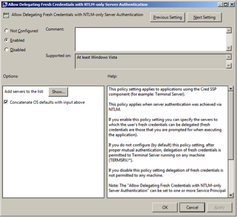 • Select Enabled to allow delegation fresh credentials with NTLM-only server authentication.