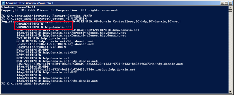 • Ensure that SPN-s WSMAN is created for your environment. Execute the following command on your domain controller machine: