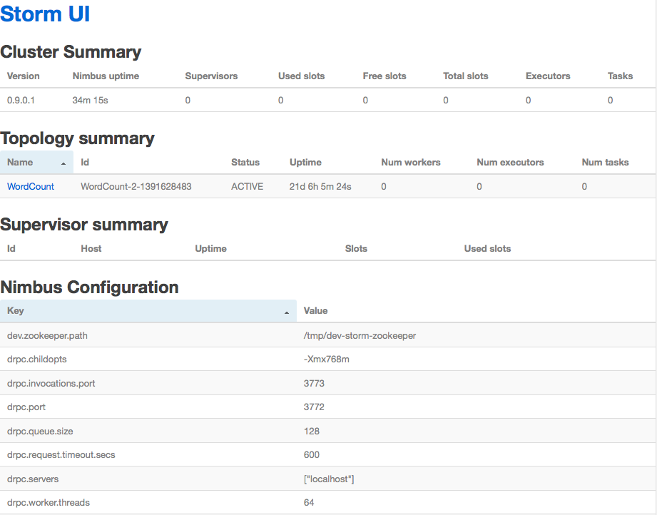 storm-drpc RUNNING pid 3368, uptime 0:31:31 storm-logviewer RUNNING pid 3365, uptime 0:31:31 storm-nimbus RUNNING pid 3370, uptime 0:31:31 storm-supervisor RUNNING pid 8765, uptime 0:00:12 storm-ui RUNNING pid 3369, uptime 0:31:31