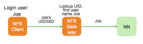 The following illustrates how the UID and name are communicated between the NFS client, NFS gateway, and NameNode.