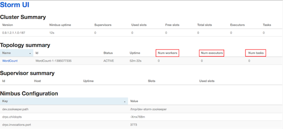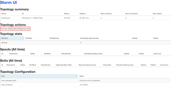 In the image above, no workers, executors, or tasks are running. However, the status of the topology remains active and the uptime continues to increase. Storm topologies, unlike traditional applications, remain active until an administrator deactivates or kills them. Storm administrators use the Storm user interface to perform the following administrative actions:
