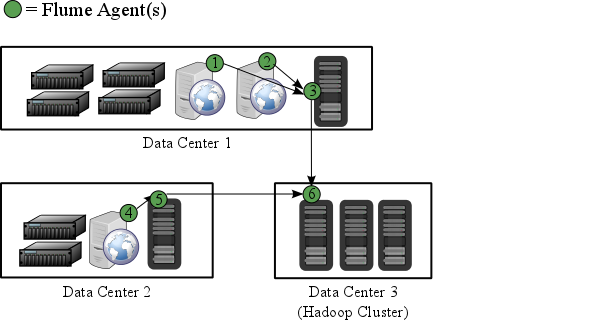 Agent 6 installed on a separate host on the same network as the Hadoop cluster in Data Center 3 to write all Avro-formatted data to HDFS