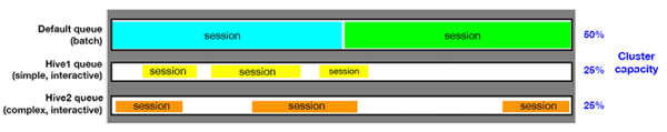 The following figure shows a configuration in which 50% of the cluster capacity is assigned to a "Default" queue for batch jobs, along with two queues for interactive Hive queries. Each Hive queue is assigned 25% of cluster resources. Two sessions are used in the batch queue and three sessions are used in each Hive queue: